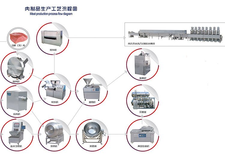 斩拌机是利用高速旋转的斩切将肉斩成颗粒状或肉糜状,还可以将肉、辅料、冰水、水一起搅拌成均匀的乳化物。本公司生产的斩拌机的刀速、锅速、斩刀与转锅的间隙达到最佳的组合,使斩切产品细度好、升温小、斩拌时间短。