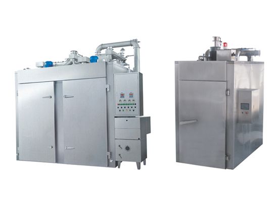 烟熏炉![]() 全电脑自动控制程序,可显示温度、湿度曲线图,在选配记录仪时可显示执行元件的监控图和各工序的运行状态表格。 进口日本SMC气控先导蒸汽阀控制蒸汽流量、温度控制准确,运行可靠,整个箱体温度温差小于1℃。 风叶经过3000转/分的动平衡校核,风速可达25米/秒,有效保证产晶在烘烤过程中上下、左右温度均匀。 烟雾发生装置采用木粒发烟器、发烟稳定、上色快,并且进入箱体中的烟干净清洁。 配备高压管道泵用于清洗盘及烟管中的污垢,在盘管及烟道中装有各种角度的喷嘴。 根据客户的要求对烟雾箱实行前后开门并可实现前后站的互锁,并达到对日本及欧盟出口注册的要求。 本设备具有烘烤、干燥、蒸煮、冷熏、热熏、冷却等功能。用户可根据产品加工工艺的不同要求,灵活选择适当的工艺程序,实现自动控制,达到熟化和灭菌之目的。 本设备由烟熏箱、自动程序控制器、烟雾发生器、烟熏车四部分组成。关键部件是由蒸汽管道、热交换器和出气通道组成完善的循环系统,箱内熏烟与热气的混合气体在两组循环风机的作用下.形成涡流区域。使混合气体以适宜的速度平衡而均匀地通过悬挂在烟熏箱内的肉制品,使其熟化和灭菌。 主要技术参数: